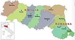 | Emilia-Romagna | 8 provincií | Bologna | ohraničena na východě Jaderským mořem, na severu řekou Pád a na jihozápadě Apeninami | Itálie |