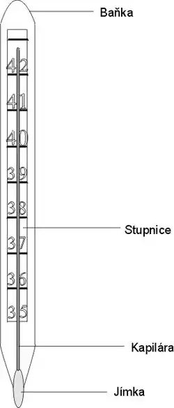 - Kapalinový teploměr – teploměr, ve kterém se k měření teploty využívá teplotní roztažnosti teploměrné kapaliny (rtuť, líh apod.).