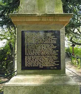 Pomník byl vztyčen v roce 1834 na vyhlídkovém místě v lázeňských lesích poblíž dřevěného kříže nad Jelením skokem. Místo pak dostalo název Theresienhöhe (Tereziina výšina).[pozn. 2] Slavnostní odhalení pomníku proběhlo dne 21. června 1834 za účasti mnoha předních osobností společenského života tehdejší doby. Účastníci slavnosti dostali opis básně, která je vyryta na pamětní desce na přední straně obelisku.[2][3][4]