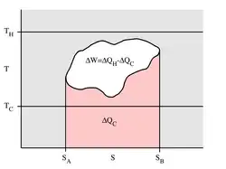 - cykly chladicích strojů nebo obrácené cykly – v nichž se přivedená mechanická práce spotřebovává na přenos tepla ze zásobníku s nižší teplotou do zásobníku s vyšší teplotou. Pracovní cyklus takovéhoto stroje ve stavovém diagramu probíhá proti směru hodinových ručiček.