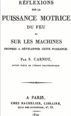 V roce 1821 se Nicolas Léonard Sadi Carnot seznámil v Magdeburku s parním strojem a jeho fyzikální model se pokoušel v následujících letech formulovat. Své závěry publikoval v roce 1824 v díle Úvahy o hybné síle ohně (Réflexions sur la Puissance Motrice du Feu).[2] Popsal v něm cyklus stroje, kde probíhá ohřívání, expanze, ochlazení a opětné stlačení ideálního plynu, dnes známý jako Carnotův cyklus. Díky tomuto dílu je tento francouzský fyzik považován za zakladatele termodynamiky.