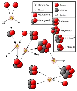 Při sloučení dvou protonů se jeden z nich přemění na neutron za vzniku deutéria, neutrína, pozitronu a energie v podobě gama záření. Toto nově vzniklé deutérium se může znovu dál na základě kvantového tunelování slučovat s protonem nebo jiným jádrem za vzniku jader těžších a uvolnění dalšího vysokoenergetického fotonu gama. Každou sekundu sloučí Slunce ve svém jádru 620 miliónů tun vodíku. Přesto je jeho životnost nejméně dalších 5 miliard let. Až dojde vodík v jádře, naruší se na krátký čas hydrostatická rovnováha, což povede k tomu, že se stane červeným obrem.