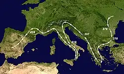 Vizigóti vyvstali z dřívějších gótských skupin (zřejmě Tervingů), kteří pronikli na území římské říše začátkem roku 376 a v bitvě u Adrianople v roce 378 Římany porazili.[3] Vztahy mezi Římany a Vizigóty byly proměnlivé. Střídavě mezi sebou válčili a pokud to bylo vhodné, uzavírali smlouvy.[4] Pod Alarichovým vedením napadli Vizigóti území Itálie a v roce 410 dobyli Řím. Poté se začali usazovat, a to nejprve v jižní Galii a nakonec v Hispánii, kde založili Vizigótské království, které existovalo od 5. do 8. století n. l.[5]