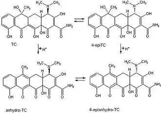 Stabilita roztoků tetracyklinů je silně závislá na pH roztoku. V kyselém prostředí dochází k jejich dehydrataci za vzniku anhydrotetracyklinů. Zředěné kyseliny rovněž podporují epimeraci a dochází ke změně konfigurace na chirálním uhlíku C-4 za vzniku 4-epitetracyklinů a 4-epianhydrotetracyklinů.