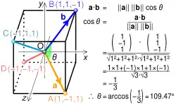 Vazebný úhel symetrické tetraedrické molekuly, jakou je například CH4, lze provést pomocí skalárního součinu dvou vektorů. Takovou molekulu lze, jak je znázorněno na obrázku výše, vepsat do krychle, v jejímž středu je čtyřvazný atom (zde uhlík), který vytváří počátek souřadné soustavy. Čtyři jednovazné atomy (zde vodíky) jsou umístěny ve vrcholech krychle (A, B, C, D) vybraných tak, že žádné dva atomy se nenachází v sousedních vrcholech spojených jedinou hranou. Když se délka hrany krychle považuje za rovnou 2 jednotkám, tak dvojice vazeb OA a OB odpovídá vektorům a = (1, –1, 1) a b = (1, 1, –1), a vazebný úhel θ je roven odchylce těchto vektorů. Velikost tohoto úhlu lze určit ze dvou vektorů definovaných jako a • b = ||a|| ||b|| cos θ, kde ||a|| je délka vektoru a. Jak je zobrazeno výše, tak tento skalární součin činí –1 a délka každého vektoru je √3, takže cos θ = –1/3 a tetraedrický vazebný úhel je roven arccos(–1/3) ≃ 109,47°.