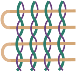 - Princip perlinkové vazby tkanin, známý už od starověku, je naznačen na nákresu vpravo dole. Dvě sousední osnovní niti se vzájemně překřižují a tak fixují polohu útku v řídkých tkaninách.[15]