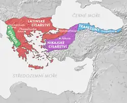 Latinské císařství a řecké nástupnické státy (epirský despotát spolu s nikájským a trapezuntským císařstvím kolem roku 1204 po skončení čtvrté křížové výpravy