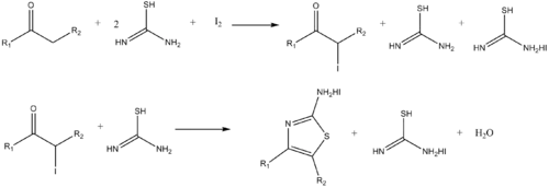 Podobně lze připravit aminothiazoly reakcemi thiomočoviny s α-haloketony.[13]