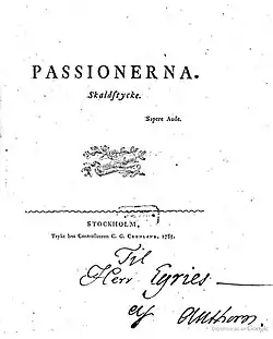 Roku 1781 odjel do Stockholmu, kde do literární soutěže přihlásil svou filozofickou báseň v hexametrech Vášně (Passionerna), ve které nastínil své panteistické a metafyzické pojetí přírody. Báseň získala čestné uznání, ale podle některých kritiků je její bohaté filozofické poselství bohužel vyjádřeno neobratným a okázalým stylem.[5] Báseň také vyvolala vleklý spor se zastáncem osvícenských literárních forem Johanem Henricem Kellgrenem.[1]