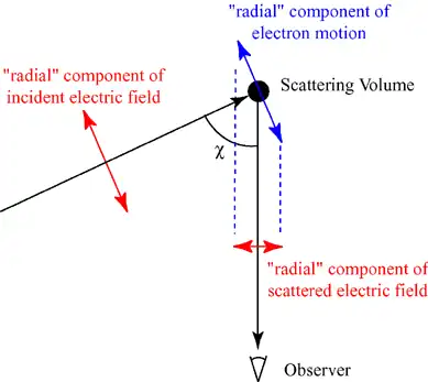 Diagram vpravo zobrazuje rovinu pozorování. Ukazuje radiální složku dopadajícího elektrického pole, které způsobuje, že nabité částice v bodě rozptylu vykazují radiální složku zrychlení (tzn. složku tečnou k rovině pozorování). Lze prokázat, že amplituda pozorované vlny bude úměrná kosinusu χ, úhlu mezi dopadajícím a pozorovaným vlnami. Intenzita, která je čtvercem amplitudy, pak bude snížena o faktor cos2(χ). Je vidět, že tangenciální složky (kolmé k rovině diagramu) nebudou tímto způsobem ovlivněny.