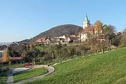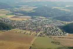 Pohled na město od jihovýchodu a park Hrádek, v pozadí je vrch Květnice, chráněný jako přírodní památka