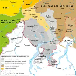 Při tažení roku 1500 dobyla vojska kantonů Nidwalden, Schwyz a Uri města Bellinzona a Riviera, která byla roku 1503 oficiálně přiznána konfederaci Ludvíkem XII. Do dalšího tažení už byla zapojena vojska ze všech tehdejších 12 švýcarských kantonů. V bitvě u Noravy roku 1513 zvítězilo Švýcarsko. Konfederace a tři spojenecké graubündenské spolky jí zajistily držení Locarna, Lugana, dnešního okresu Vallemaggia, Mendrisia, Cuvia, Ravaglie, Chiavenny, Bormia, Tre Pievi a Valtelliny. Roku 1515 bylo Švýcarsko poraženo Františkem I. Francouzským v bitvě u Marignana a vzdalo další výboje, ale mír z roku 1516 mu umožnil ponechat si získaná území, s výjimkou Ossolského údolí, která bylo předáno zpět Milánskému vévodství. Uzemí moderního kantonu představuje poslední území, které kdy Švýcarska konfederace dobyla. Celé území moderního kantonu bylo rozděleno na osm fojtství (ne příliš odlišných od okresů moderního kantonu Ticino), z nichž Leventina zůstávala až do roku 1798 přímou součástí kantonu Uri, zatímco zbytek území byl spravován společně tehdejšími 12 kantony.[2]