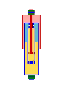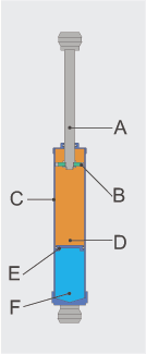 ![]() Táhlo (A) prostřednictvím oleje (D) pohybuje membránou (E) a tím stlačuje plyn v komůrce (F) |