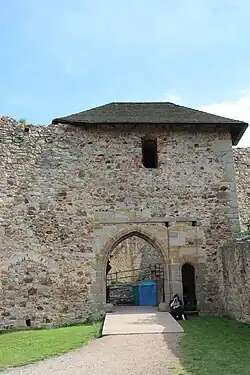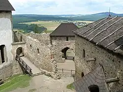 Cesta se na prvním nádvoří pravoúhle stočila, překonala vyzděný příkop a vstoupila do třetí věžové brány, za kterou se nachází druhé nádvoří nepravidelného tvaru. Západní dělicí zeď pochází až z doby renesančních úprav.[32]