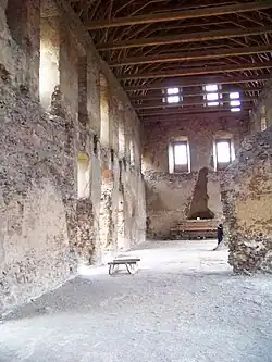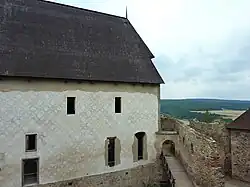Křížovými klenbami byly zaklenuté i dvě menší místnosti po levé straně sálu,[37] které sloužily k ubytování krále.[36] Vytápěly je rohové krby a z obou vedly padací můstky na ochoz hradby. Trakt vpravo od velkého sálu byl rozdělen do dvou pater. Ve spodní místnosti byl prevét, krb a portálek, který s použitím žebříku umožňoval sestoupit do šíjového příkopu. V pozdějším období byla místnost rozdělena příčkou. V horním patře byla jediná místnost spojená padacím můstkem s ochozem protější hradby. Ve druhém patře se z původního rozvržení dochovaly jen dvě místnosti a zbytek tvoří sál osvětlený třemi okny obrácenými k nádvoří a dvěma okny orientovanými do příkopu. Část sálu sloužila během renesance jako kaple.[34]