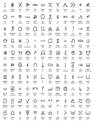 | Písmo | latinka, „sitelen pona“ (logografický), „sitelen sitelen“ (logografický s abecedním rozšířením pro cizí slova) |