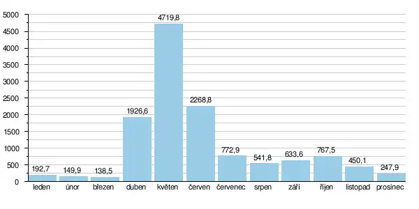 Průměrné měsíční průtoky řeky Tom ve stanici Tomsk v letech 1936 až 2000:[2]