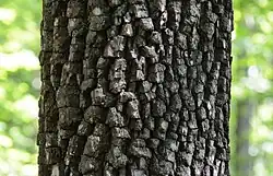Opadavý, dvoudomý strom dorůstající v přírodě do výše 15 až 25 m a mající rovný a dlouhý kmen o průměru do 40 cm. Kůra kmene je červenohnědě, později téměř černě zbarvená a hluboce zvrásněná do nepravidelných čtvercových nebo obdélníkových šupin, koruna je v mládí vzpřímená, kuželovitá a s věkem poklesává. Větve s hladkou, hnědou nebo šedou kůrou jsou porostlé krátce řapíkatými listy s čepelemi široce vejčitými až eliptickými, 6 až 15 cm dlouhými a od 2,5 po 8 cm širokými. Čepele jsou na vrcholu zašpičatělé, po obvodě celistvé, na svrchní straně jsou tmavě zelené a lesklé, na spodní straně světlejší a někdy kratičce chlupaté, listovou žilnatinu mají zpeřenou.