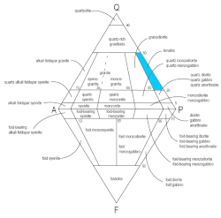 - ↑ Tonalit je synonymum pro křemenný diorit.[3] Hornina se strukturou podobá žule.[3] Tvoří přechod od žul k pravým (bezkřemenným) dioritům.[3] Na rozdíl od žul obsahuje větší podíl tmavých součástek (biotit a amfibol) a má také bazičtější sodnovápenatý živec – oligoklas až andezín.[3] Naproti tomu obsahuje méně křemene a draselného živce (ortoklasu).[3]
