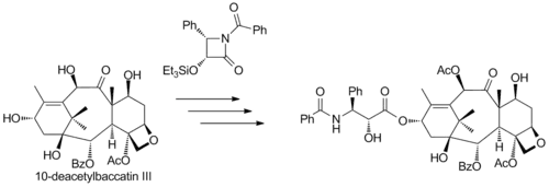 Průmyslová částečná syntéza taxolu začíná u 10-deacetylbaccatinu III a spočívá v navázání Odžimova laktamu na jeho volný hydroxyl: