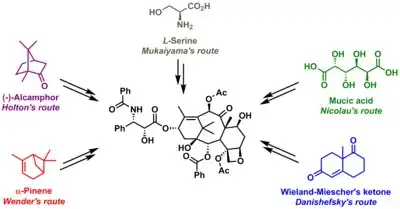 - Mukaijamova totální syntéza taxolu (1998)[9] Prekurzor: L-serin postup: lineární syntéza B, C, A a D. Viz příslušný článek.