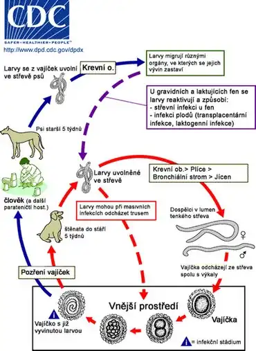 - ↑ a b c d e f Sun Huh. eMedicine: Toxocariasis [online]. Omaha, Nebraska: WebMD, rev. 2006-06-15 [cit. 2008-02-08]. Dostupné online. (anglicky)
