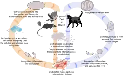 Z trusu koček se uvolňují tzv. oocysty, které sporulují a vydrží v prostředí velmi dlouho. Když je požije s kontaminovanou potravou teplokrevný živočich, z oocyst vzniknou tzv. tachyzoity (řec. tachos – rychlost). Tachyzoity rychle zaplaví nervovou a svalovou tkáň a postupně z nich vzniknou bradyzoity (řec. brady – pomalý). Bradyzoity vydrží v mezihostiteli pravděpodobně celý život v zapouzdřeném stavu. Kočka (definitivní hostitel) se může nakazit několika způsoby: buď tím, že pozře maso obsahující bradyzoity, nebo někdy potravou obsahující oocysty. Ve střevě kočky dochází k množení a tvorbě oocyst ve střevních buňkách.[2][5]