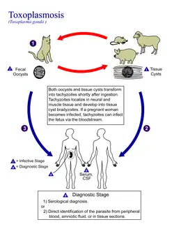 - ↑ a b c d e TENTER, Astrid M.; HECKEROTH, Anja R.; WEISS, Louis M. Toxoplasma gondii: from animals to humans. International journal for parasitology. 2000-11, roč. 30, čís. 12–13, s. 1217–1258. PMID: 11113252 PMCID: PMC3109627. Dostupné online [cit. 2017-07-25]. ISSN 0020-7519. PMID 11113252.