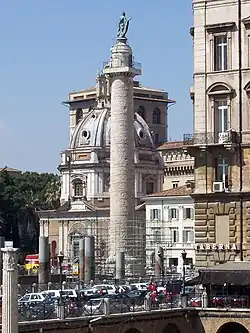 Trajánův sloup, za ním kostel P. Marie loretánské a vzadu věž Palazzo Venezia