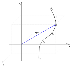 Trajektorii pohybu lze vyjádřit pomocí polohového vektoru jako funkci času , tzn. – na obrázku zobrazen modrou šipkou. Vektor má začátek v počátku souřadného systému.