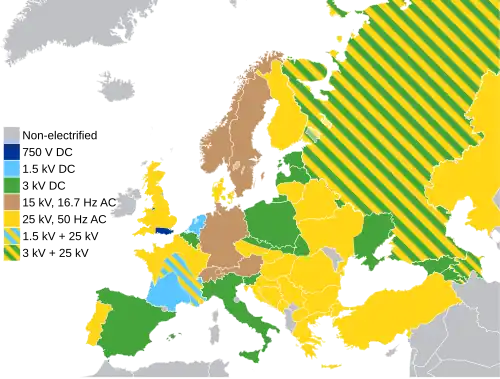 - 3 kV (sever Česka, sever Slovenska, Španělsko, Itálie, Belgie, Polsko, Lotyšsko, Estonsko, většinou Rusko, Slovinsko)