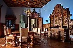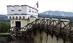 Hrad má dvě věže; západní věž a východní věž. Každá má jinou podobu střechy. Jednotlivá patra podepírají buď oblouky ze zdiva, nebo jsou dřevěné stropy.[22] V západní věži se nachází tzv. rytířský sál.[4]