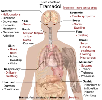 Nejčastější nežádoucí účinky tramadolu zahrnují nevolnost, sucho v ústech, poruchy trávení, bolesti břicha, závratě, zvracení, zácpu, ospalost a bolest hlavy.[17][18] Ve srovnání s jinými opioidy, respirační deprese a zácpa jsou u tramadolu považovány za menší problém. Tramadol rovněž může snížit práh pro vypuknutí epileptického záchvatu, tj. vysoké dávky mohou způsobit epileptický záchvat.