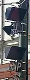 Přejezd zabezpečený světelným signalizačním zařízením: červenobíle pruhovaný sloupek. Značka je doplněn trojúhelníkovou deskou, a její podoba je podobná silniční dopravní značce č. A 10 „Světelné signály“, umístěnou na tento sloupek stejný jako k označení nezabezpečeného přejezdu. (Na pražských tramvajových drahách se nepoužívá.)