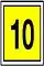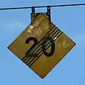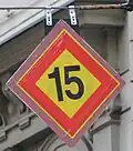 Červenožlutě orámovaná kosočtvercová tabulka o rozměrech 300×300 mm, na již je čísla označující nejvyšší rychlosti v kilometrech za hodinu. |