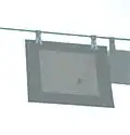 Pracovní trolejový kontakt mimo provoz: návěst tvoří označení pracovního trolejového kontaktu překryté černou tabulkou, na které je vyznačen žlutý kříž.
