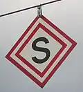 Červená čtvercová tabulka o rozměrech minimálně 300×300 mm, na ním je v ní černé písmeno ”S“. Označuje části kolejiště, na druh výhybky je oddělen provozní zařízení o vjezdu na oddělenou výhybkou. |