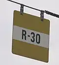 Žlutá čtvercová tabulka o rozměrech 300×300 mm, na ní je bílá čára a s písmenem ”R“ s čárou a čísla, který se označuje povolený izolátor na části tratě a jestli to značí nejnižší nebo nejvyšší úsek platnosti. |