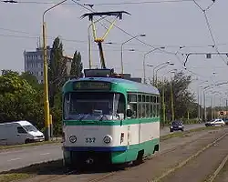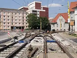 ![]() Vůz KT8D5 přejíždí dočasnou kolejovou spojku Californien za zastávkou Radnica starého mesta | |