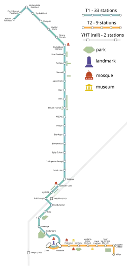Smlouva na výstavbu první tratě, kterou spolufinancoval německý kapitál, byla podepsána s firmou Siemens AG v květnu 1986, základní kámen stavby byl položen v červenci 1987 za účasti tehdejšího tureckého premiéra Turguta Özala. Pro provoz byly již v roce 1988 zakoupeny první ojeté tramvaje Duewag z Kolína nad Rýnem, které byly v průběhu roku 1989 dodány. Kvůli novému starostovi, zvolenému v komunálních volbách konaným v témže roce, byly ale veškeré práce na stavbě tramvajové trati zastaveny, neboť chtěl městskou rychlodráhu s vlastním tělesem. Výstavba tratě byla znovu zahájena v létě 1991, od 23. dubna 1992 probíhaly cvičné a zkušební jízdy z vozovny do smyčky Cumhuriyet. Běžný provoz byl zahájen 28. září 1992 na trati mezi smyčkami Alââddin a Cumhuriyet o délce 10,4 km. Dne 19. dubna 1996 byla trať prodloužena o dalších 7,6 km ze smyčky Cumhuriyet do konečné zastávky Üniversitesi.[1]