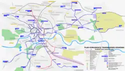 Obrázky, zvuky či videa k tématu tramvajová doprava v Krakově na Wikimedia Commons - Mapa linek s aktuální polohou vozidel