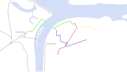 Tramvajová síť postrádala pevné spojení mezi oběma břehy Oky. V létě fungoval pontonový most, v zimě se koleje ukládaly na led řeky. V době posunu ledu na podzim a na jaře se spojení přerušovalo, občas i na několik týdnů. Tento problém byl vyřešen v roce 1933, kdy byl postaven Kanavinský most.