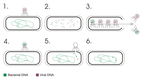 Některé bakteriofágy zabudují do DNA svého hostitelského organismu svou DNA, obvykle ale výměnou za část genetické informace hostitele. Když pak virus napadne další buňku, může opět nastat začlenění této DNA do genomu hostitelské bakteriální buňky, zejména metodou crossing-overu.[3]