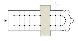 Hnědě je vyznačeno umístění transeptu v půdorysu chrámu