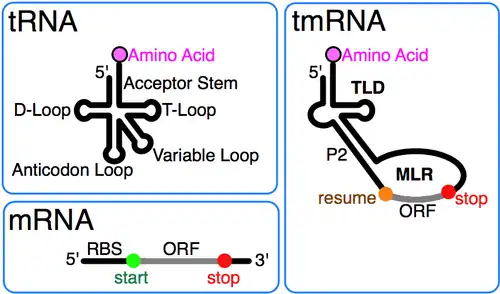 tmRNA obsahuje řadu modifikovaných bází, například pseudouridin a ribothymidin, čímž tmRNA mimikuje strukturu tRNA.,[3]