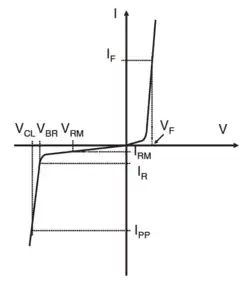 - VCL – upínací napětí (anglicky clamping voltage) při němž může diodou procházet maximální špičkový proud IPP. Výrobci tuto hodnotu měří s proudovým omezením na 1 mA nebo 10 mA, které se mohou lišit od skutečných aplikačních podmínek.[2]