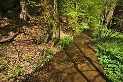 Díky vysokému obsahu železa jsou koryto potoka i jeho voda zbarveny do červena.[8]