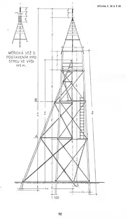 - ↑ Návod jak vykonávati katastrální měřické práce pro obnovení pozemkového katastru novým katastrálním řízením.: Instrukce A pro katastrální měřické práce. (Výnos ministerstva financí ze dne 30. června 1939. Č. 60.000/38-III/6A). České znění. 1. vyd. Praha: ministerstvo financí, 1940. XVI, 300 s. (Návody pro vykonávání katastrálních měřických prací.; sv. A.). Kapitola c. Stavba měřické věže., s. 35–43 a přílohy č. 20–21 i 24–27. Tiskl E. Beaufort, a. s. v Praze.
