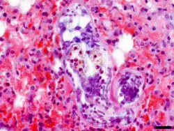 Infikované myši i ostatní zvířata (křečci, králíci, makakové rhesus) mají na povrchu plic četné hemoragie.[16][20] Při histopatologickém vyšetření je pozorováno překrvení a edémy plicní tkáně a 4. den po infekci také shlukování lymfocytů v okrajových částech plicních laloků.[16] Schistosomula T. szidati se v plicích myší nalézají nejdříve 10 h po infekci[19] a nejpozději 10. den po infekci.[16] S přihlédnutím na nepoškozený tegument je za jejich úhyn zodpovědný buď neznámý imunologický faktor, nebo nedostatek esenciálních nutričních látek.[22]