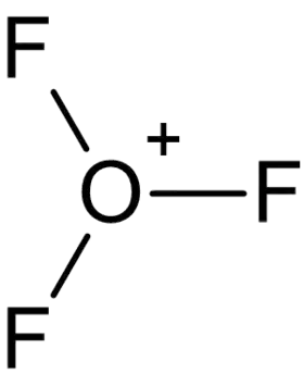 3 . Je strukturním ekvivalentem hydroniového iontu, ve kterém jsou atomy vodíku obklopující centrální kyslíkový atom nahrazeny atomy fluoru, a je isoelektronický s fluoridem dusitým. Atom kyslíku v něm má oxidační číslo +4.